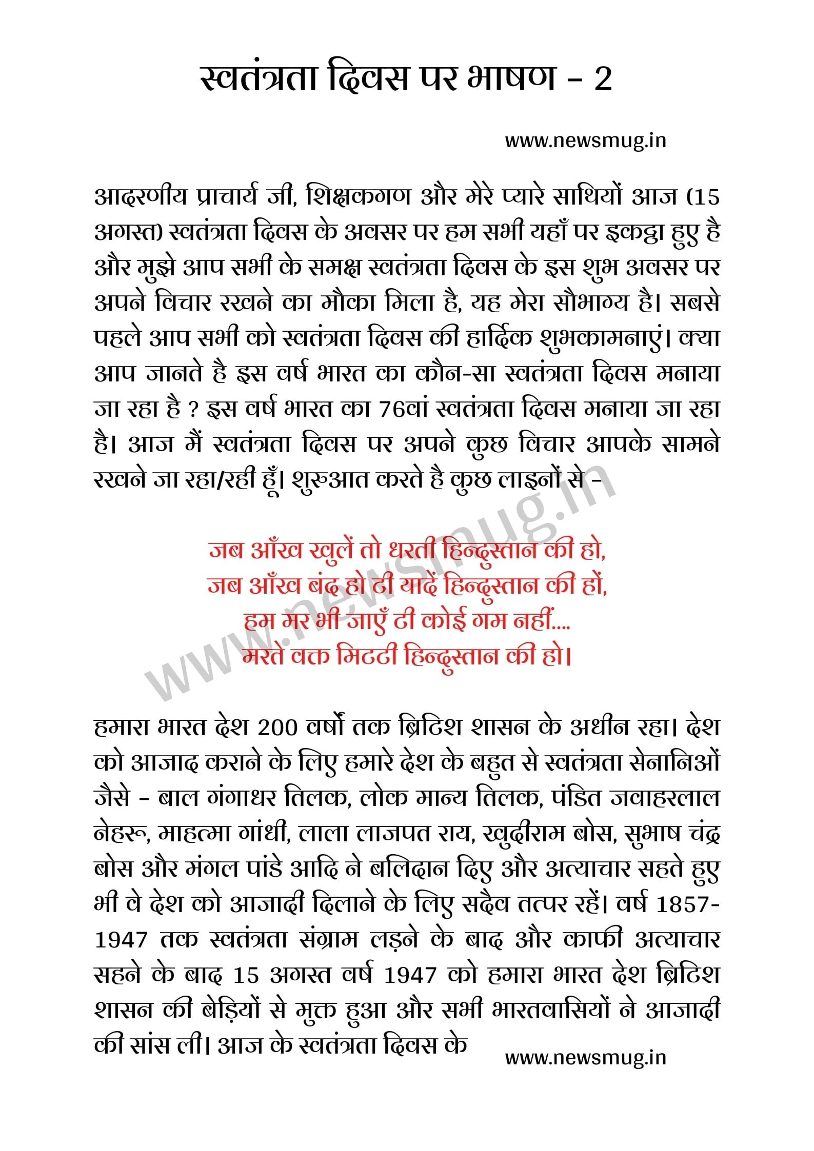 आदरणीय प्राचार्य जी, गुरूजन और यहां उपस्थित मेरे प्यारे साथियों आज (15 अगस्त) स्वतंत्रता दिवस के अवसर पर हम सभी यहां पर एकत्र हुए है. और मुझे आप सभी के समक्ष स्वतंत्रता दिवस की इस शुभ बेला पर अपने विचार रखने का मौका मिला है, यह मेरा सौभाग्य है. सबसे पहले आप सभी को स्वतंत्रता दिवस की हार्दिक शुभकामनाएं. दोस्तों क्या आप जानते हैं इस वर्ष भारत का कौन-सा स्वतंत्रता दिवस मनाया जा रहा है ? इस वर्ष भारत का 76वां स्वतंत्रता दिवस मनाया जा रहा है. आज मैं स्वतंत्रता दिवस पर अपने कुछ विचार आपके सामने रखने जा रहा/रही हूँ. जिसकी शुरुआत में कुछ लाइनों से कर रही हूं –