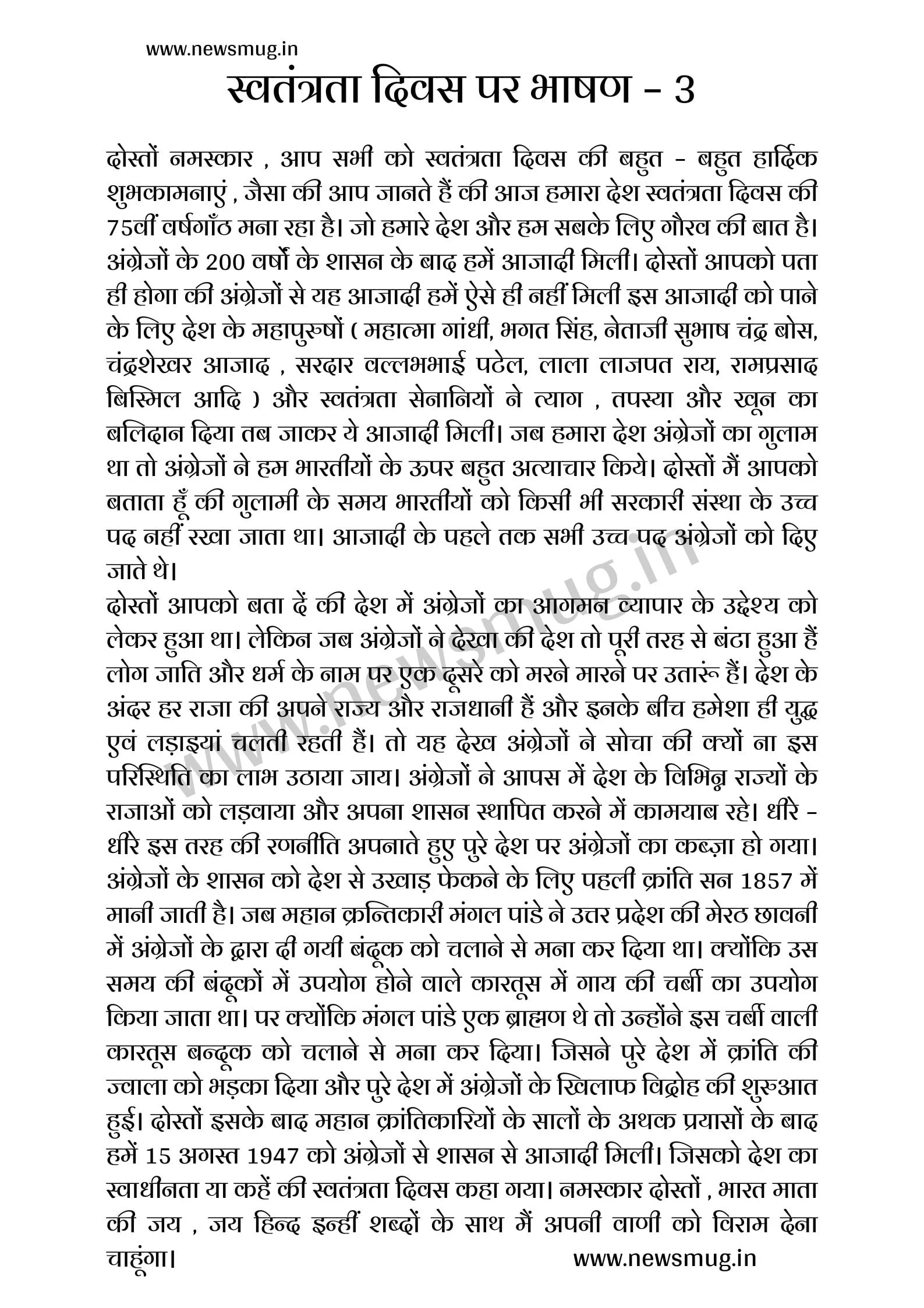 दोस्तों आपको बताते चलूं कि, देश में अंग्रेजों का आगमन व्यापार के उद्देश्य को लेकर हुआ था. लेकिन जब अंग्रेजों ने देखा की देश तो पूरी तरह से बंटा हुआ हैं लोग जाति और धर्म के नाम पर एक दूसरे को मरने मारने के लिए तैयार हैं. देश के अंदर हर राजा की अपने राज्य और राजधानी हैं और इनके बीच हमेशा ही युद्ध एवं लड़ाइयां चलती रहती हैं. यह सब कुछ देख अंग्रेजों ने सोचा की क्यों ना इस परिस्थिति का लाभ उठाया जाय. अंग्रेजों ने आपस में देश के विभिन्न राज्यों के राजाओं को लड़वाया और अपना शासन स्थापित करने में कामयाब रहें. और हुआ वहीं धीरे – धीरे इस तरह की रणनीति अपनाते हुए पूरे भारत देश पर अंग्रेजों ने कब्जा कर लिया. ब्रिटिश हुकूमत के शासन को देश से जड़ से उखाड़ फेंकने के लिए पहली क्रांति सन 1857 में मानी जाती है. जब महान क्रन्तिकारी मंगल पांडे ने उत्तर प्रदेश की मेरठ छावनी में अंग्रेजों के द्वारा दी गयी बंदूक को चलाने से मना कर दिया था. कारण बंदूकों में इस्तेमाल होने वाले कारतूसों को गाय की चर्बी से बनाया जाता था. ऐसे में क्योंकि मंगल पांडे एक ब्राह्मण थे तो उन्होंने इस चर्बी वाली कारतूस बन्दूक को चलाने से मना कर दिया. जिसने पूरे देश में क्रांति की ज्वाला को और अधिक भड़का दिया. जिसके बाद पूरे भारत देश में अंग्रेजों के खिलाफ विद्रोह की नीति शुरू हुई. मित्रों इसके बाद महान क्रांतिकारियों के सालों के अथक प्रयासों के बाद हमें 15 अगस्त 1947 को अंग्रेजों से शासन से आजादी मिली. जिसको देश का स्वाधीनता या कहें की स्वतंत्रता दिवस कहा गया. धन्यवाद मित्रों अपनी वाणी को विराम देता हूं, भारत माता की जय , जय हिन्द……….