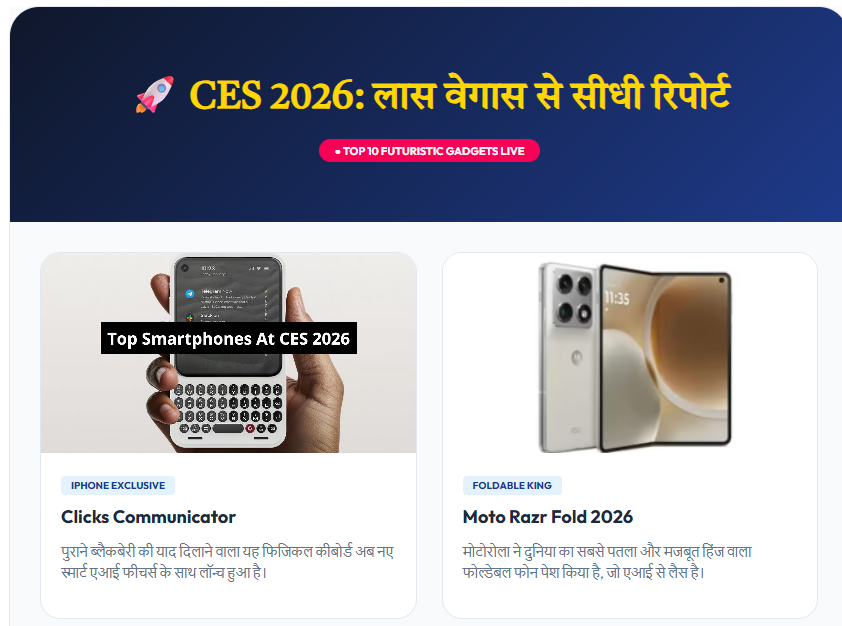 7 जनवरी 2026—लास वेगास का कन्वेंशन सेंटर आज दुनिया की सबसे उन्नत तकनीकों का गवाह बन रहा है। CES 2026 Highlights की चर्चा इस वक्त पूरी दुनिया में है। गूगल ट्रेंड्स के अनुसार, गैजेट प्रेमी इस समय “Clicks Communicator” और “Motorola Foldable News” को लेकर सबसे ज्यादा उत्सुक हैं।