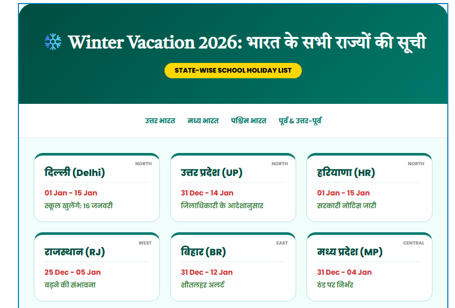 ❄️ Winter Vacation 2026: भारत के सभी राज्यों की सूची